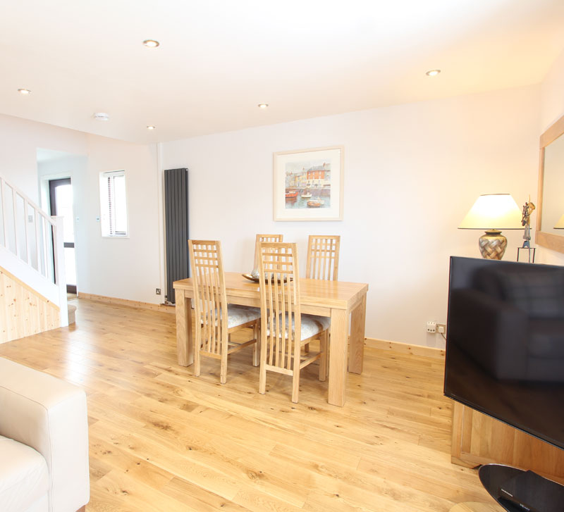 The lounge is furnished with two comfortable leather sofas, side tables and lamps, local padstow artwork adorn the walls. Entertainment is provided by a large screen 3D smart TV (48″), with Blu Ray player and HDD recording built into the TV. A selections of books, guide books, games and DVD’s can also be found in the cottage.